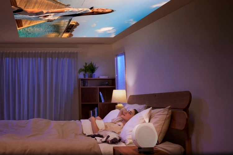 Like other projectors in the GV line, it’s mounted on a base that allows it to tilt 135 degrees and pan a full 360 degrees, allowing you to simply place the projector on one surface while beaming it to any area in the room. The big use-case for this, of course, is for use in the bedroom, where you can put the projector in the nightstand and adjust it to beam images on any part of the walls or ceiling.