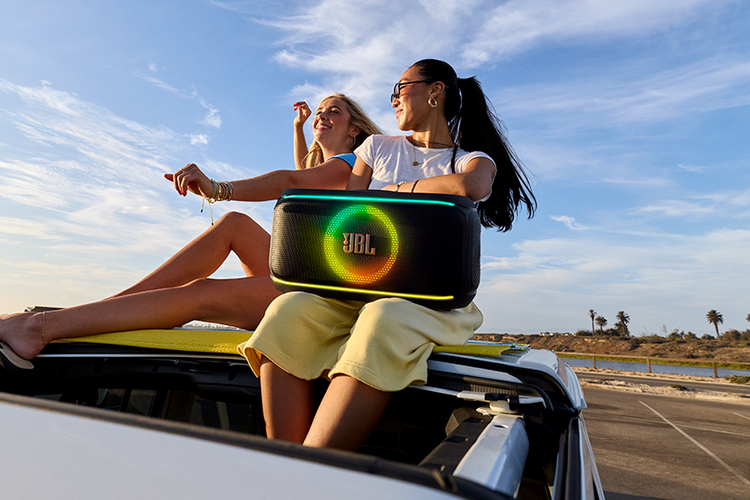 The JBL PartyBox On-the-Go 2 is a boombox-style party speaker, so it’s on the bigger side of portable speaker designs. It measures 19.7 x 10.2 x 8.7 inches (width x height x depth), so it’s portable enough to carry in hand like the boomboxes of old, all while being able to fit in larger drivers for bigger, louder party sounds. Like other party speakers, it comes with multi-color LEDs that can glow in different light patterns and strobe effects to create a true party atmosphere, all while coming with a splashproof build (IPX4) so you can take it outside without much worries.