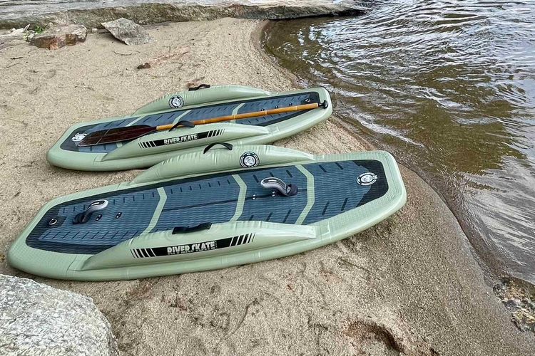 The Riverskate looks slightly different than your standard SUP. Instead of pointed or rounded ends, it has flat cutoff tips at the front and rear, essentially removing the nose and tail found on other SUPs. In its place, they put raised sections along the sides, which they call grab wings. According to the outfit, those patent-pending wings redistribute the volume traditionally found on the nose and tail towards the center rails, creating a lower-volume board that’s much more stable than your standard SUP. Aside from those benefits, the wings also help with proper body positioning, since paddlers can brace their feet (or knees, if they’re kneeling) against them. The outfit claims this makes it an excellent learning tool for novice riders still working on their fundamentals.